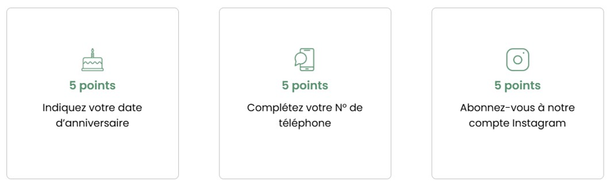 A la création de votre compte sur notre site, vous cumulez d'ores et déjà des points, pour cela il vous suffit de renseigner, votre date de naissance, votre numéro de téléphone et de vous inscrire à notre Newsletter.
