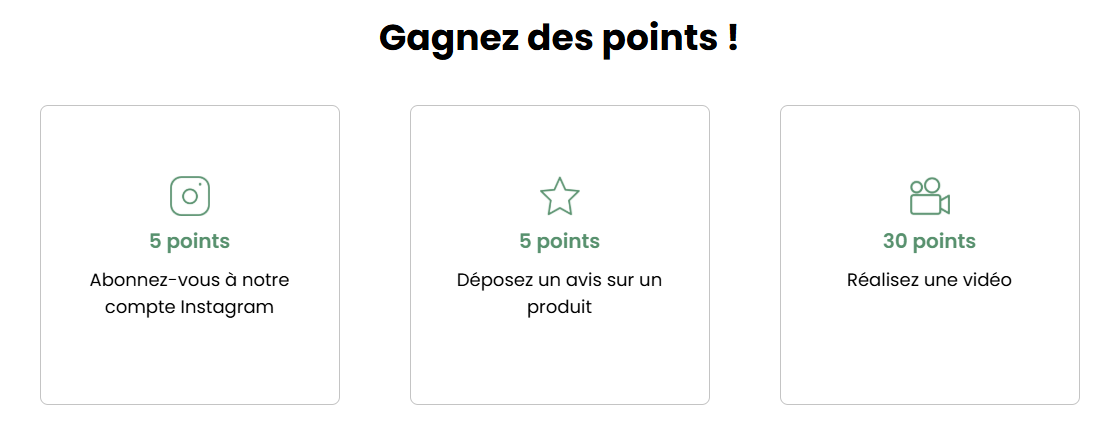 Vous recevez un point par euro dépensé sur le site, mais également en réalisant des missions proposées sur votre espace fidélité (Suivre notre compte Instagram, donner votre avis sur les produits reçus, et plein d'autres).