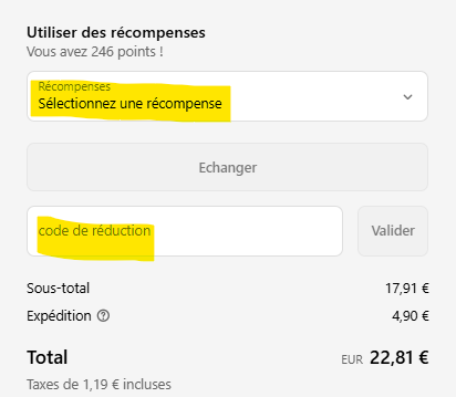 - Sélectionner votre récompense dans le menu déroulant dans votre panier ou coller votre code dans l'espace prévu pour les codes de réduction :
